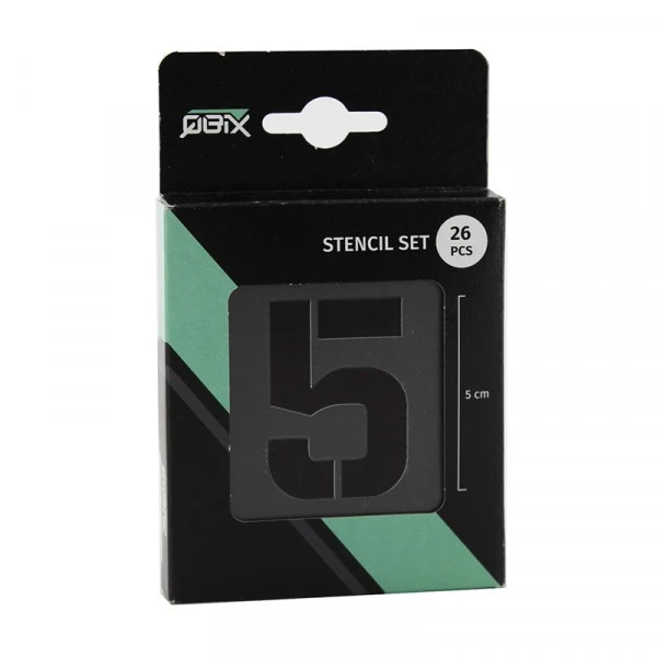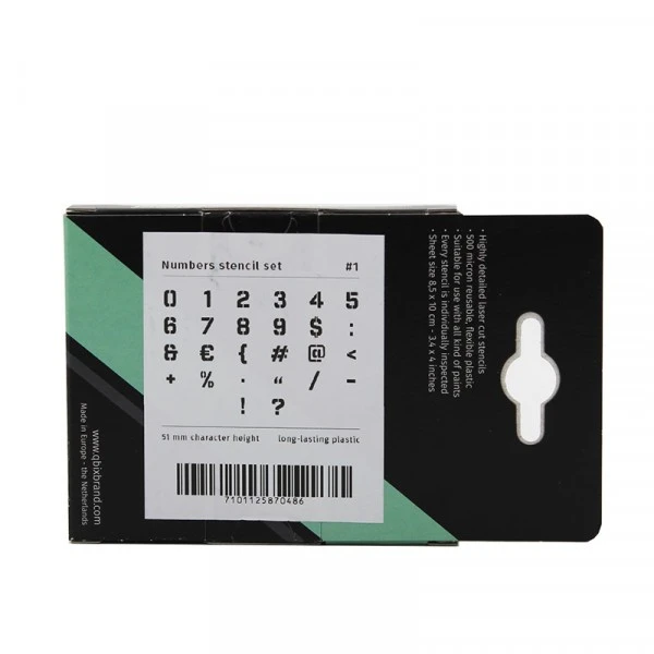 Dimensions de chaque pochoir10 x 8,5 cm. Hauteur des chiffres et caractères5,1 cm.