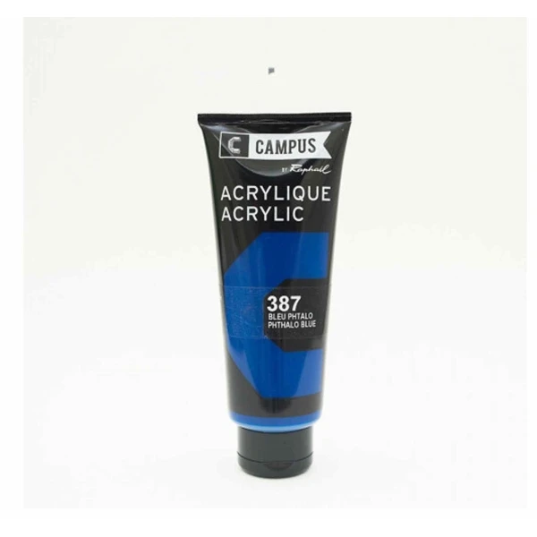 Peinture acrylique bleu phtalo d’une contenance de 100 ml, idéal aussi bien en épaisseur qu’en glacis et possède une très bonne résistance à la lumière . Dilutioneau, médiums acrylique en fonction de l’effet désiré. Nettoyage des outilseau chaude. SupportsToiles, carton, papier toilé, bois. Séchagesec au toucher 1h selon l’épaisseur. Séchage définitif48h selon l’épaisseur. La peinture acrylique se compose de 2 éléments principauxun mélange de pigments et le liant (une émulsion aqueuse de résines synthétiques polyacryliques ou polyvinyliques d’origine minérale, organique, ou synthétique). À cette pâte s’ajoute une charge afin d’en augmenter le volume, la consistance ou l’opacité. La peinture acrylique est très facile à préparer, et simple à appliquer sur tous les types de surface. De plus, elle est facilement miscible, très solide, indélébile, dégage une très faible odeur, et sèche en quelques minutes, ce qui permet de superposer rapidement les différentes couches. C’est cette dernière caractéristique qui la différencie de la peinture à l’huile, très lente à sécher mais qui permet les fondus et les repentirs.