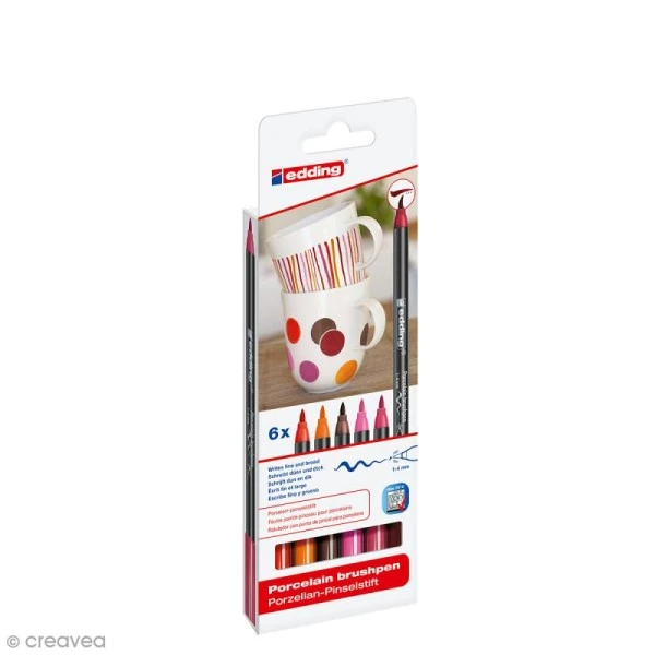 Utilisez ce set de feutres pour porcelaines (Camaïeu rouge) pour décorer joliment de la porcelaine, de la céramique émaillée, mais aussi du verre allant au four. La pointe pinceau de ces feutres (1-4 mm d’épaisseur) est flexible, ce qui permet à la fois des aplats larges comme des traits fins. L’encre épaisse de ces feutres Edding Camaïeu rouge vous permettra d’obtenir un rendu uniforme de la couleur. De plus, l’encre ne fait ni coulures, ni gouttes et ne s’étale pas. De quoi faciliter tous vos travaux !