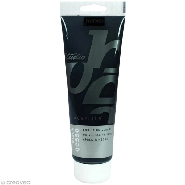 Le tube de gesso Noir de Pébéo Studio (appelé également médium), est un enduit universel vous permettant de préparer votre support à peindre en renforçant l’accroche de la peinture. Il est particulièrement couvrant, et sèche rapidement.