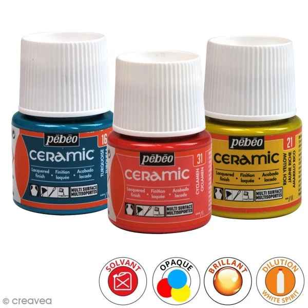 La peinture céramic Pébéo sera idéale pour personnaliser tous vos objets en céramique. Les couleurs opaques et brillantes de la peinture spéciale céramique donneront un effet laqué à vos créations. Faïence, terre cuite, bois, métal, toile, céramique : la peinture ceramic pourra s’appliquer sur de nombreux supports !