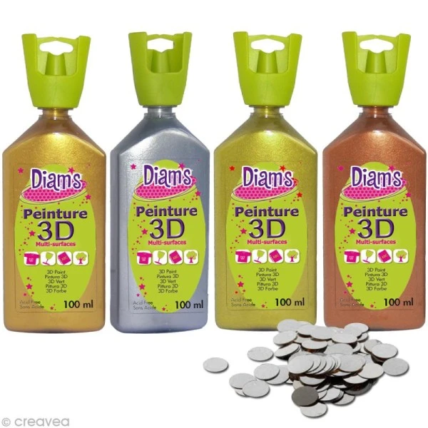 Idéal pour découvrir la peinture 3D, le kit Diam’s Noël métallisé est composé de 4 grands tubes de 100 ml de peinture, mais existe aussi en tube de 37 ml en 84 coloris et en kit de 6 mini tubes. Cette peinture à effet existe en plusieurs effets 3Dbrillante, nacrée, glacée, pailletée, et effets spéciaux.