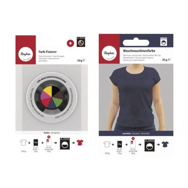 Concentré de colorant bleu pour la teinture des textiles dans la machine à laver et fixateur de couleurs (pour tissu 500 g, sachet de 50 g). Pour une coloration à haute résistance à la lumière, lavable en machine et résistante à la cuisson (lavable jusqu’à 95°C). 25 g pour 500 g de tissu sec (coloration intense). Pour les fibres naturelles sans apprêt et les tissus mélangés avec une part de synthétique (max 50%). En outre, 50 g de réactif et 1 kg de sel sont nécessaires par coloration. Guide rapide1. Dissoudre le concentré de colorant et le réactif séparément dans de l’eau chaude. 2. Mettre le matériel à teindre humide et sans apprêt avec du sel dans la machine à laver. 3. Activer le lavage principal à 60°C. 4. Après 3 min, verser le concentré de colorant dissous, et après 3 min supplémentaires le réactif dissous, dans le tambour via le tiroir de la lessive. 5. Après le processus de teinture, laver au cycle délicat.