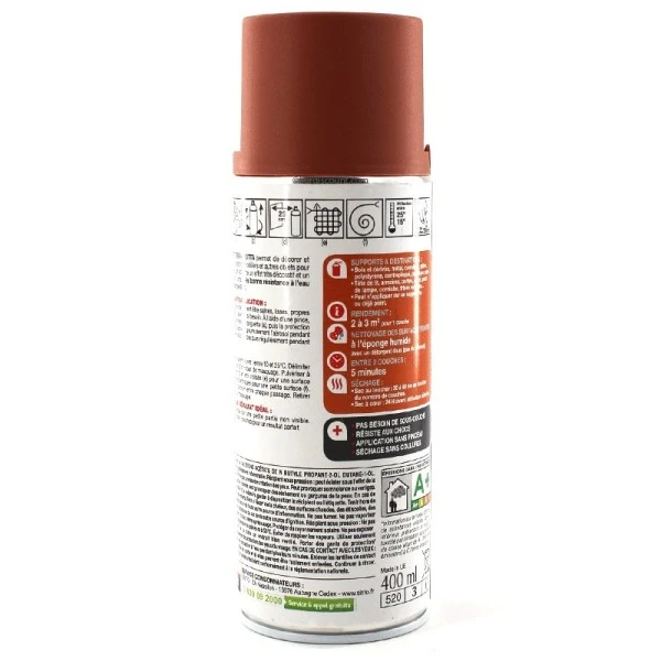 Chaque bombe a une contenance de 400 ml. Les aérosols Idéespray résistent à la rouille et aux effets du temps. Les teintes “”classiques”” sont constituées d’acrylique permettant un rendu brillant et belle couvrance. La peinture adhère parfaitement sur le bois, le métal, le plastique ou le verre. De plus, le temps de séchage est rapide.