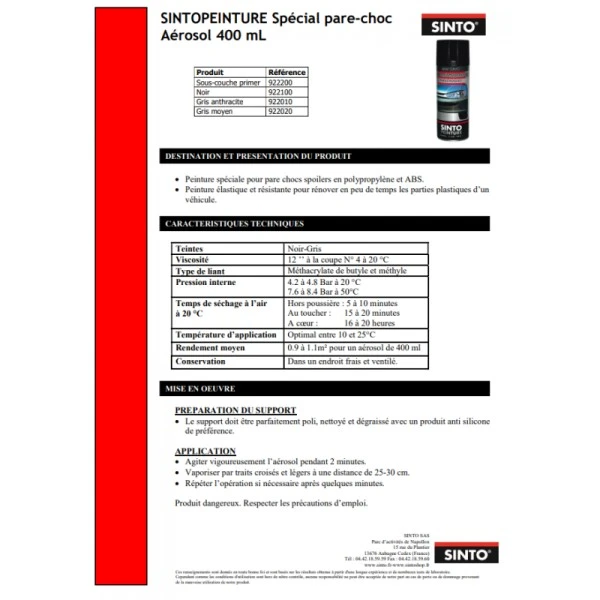 Données techniques pour Bombe de peinture pour pare choc – gris anthracite – Sinto